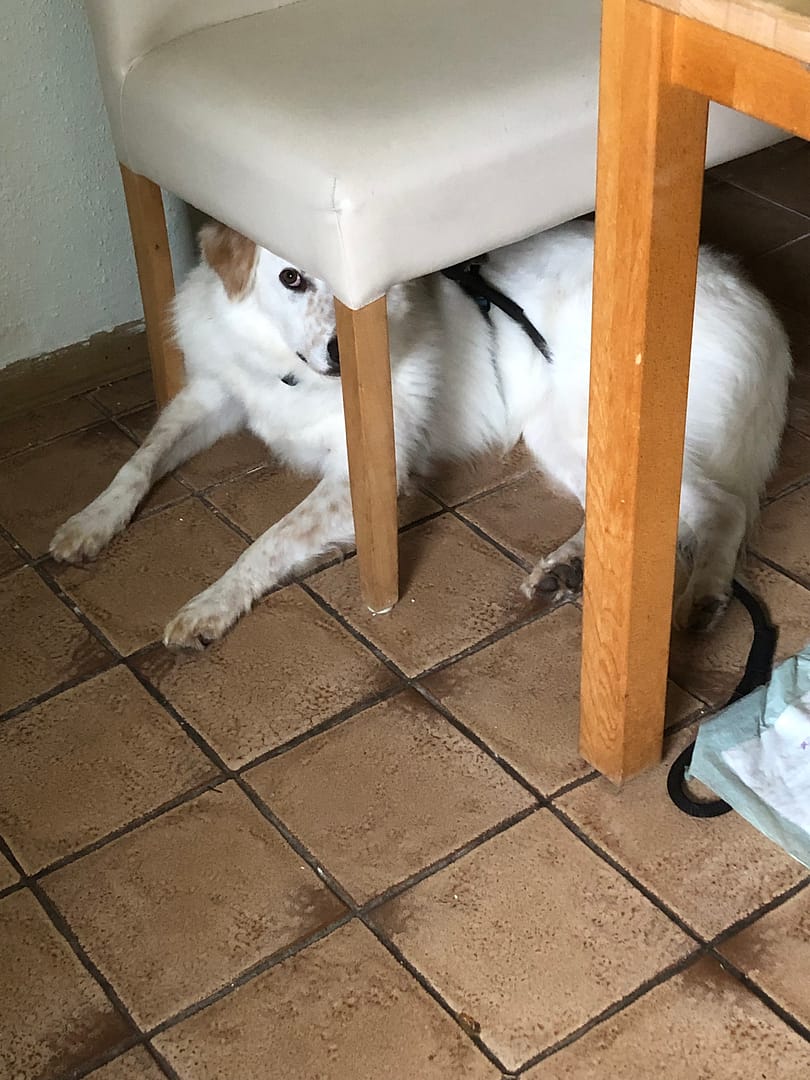 Der erste „richtige“ Angsthund war unsere Masha. Sie kam, sah, erschreckte und erstarrte. In dieser Reihenfolge. Für lange Zeit. Wir haben sie gelassen, sie durfte sich alles in Ruhe anschauen. Zu Beginn lag sie nur unter dem Küchentisch, wich vor uns zurück. Nach wenigen Tagen wich sie zwar nicht mehr zurück, doch Berührungen waren ihr dennoch nicht geheuer. Sie ließ sich anfassen und auch problemlos die Treppe hoch- und runtertragen, doch alles in einem Zustand völliger Ergebenheit.