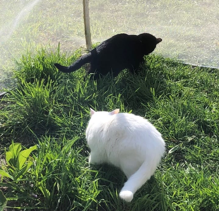 Hund und Katz verstehen sich absolut. Die Hunde waren nach ihrem Einzug zwar etwas erstaunt, schienen aber die beiden Katzen nicht als Gefahr zu sehen. Und manchmal haben wir den Eindruck, als suche Dino den weißen Kater, um heimlich mit ihm zu schäkern….