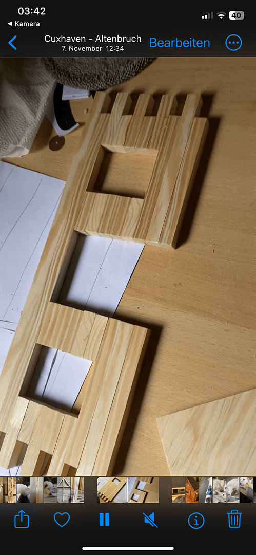In meinen ersten Versuchen habe ich jeweils die Bodenplatte genommen und darauf die zurecht gesägten Streben gesetzt. Das ist Murks! Nimm dir also zuerst die 4 Seiten vor, baue diese jeweils einzeln. Dann lege sie übereinander, sie sollten absolut identisch sein, sonst passt es am Ende nicht. Notfalls klemmst du die beiden Hälften zusammen und passt die Ungleichheiten etwas an.